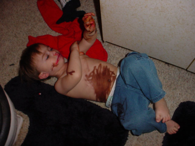 Speaking of "experience"... my wife learned today why NOT to fall asleep with a two year old playing in the room. She woke up to hear the little guy say, "I'm coloring!" Ok, she didn't really even wake up then. But when she did wake up she found him "coloring" on her shoe with a marker! Then she realized he was using her shoe as a canvas because he had run out of space on his body!!! She took pictures and showed them to me when I got home. He was every color of the rainbow. His face actually was painted like a clown (I thought this was pretty good for a two year old). His belly was covered in brown ink. He started asking her for a wipe to clean up. She recommended a bath instead. Below are some of the pictures. They are too funny... yes, they are. I didn't have to clean him up!